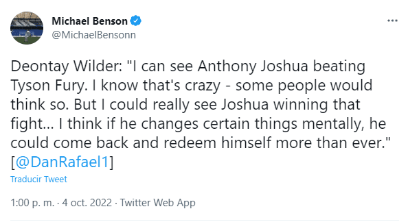 “Puedo ver a Anthony Joshua derrotando a Tyson Fury. Sé que es una locura, algunas personas lo pensarían. Pero realmente puedo ver a Joshua ganando esa pelea.Creo que si cambia ciertas cosas mentalmente, podría volver y redimirse más que nunca”, expresó en una entrevista concedida a Dan Rafael.