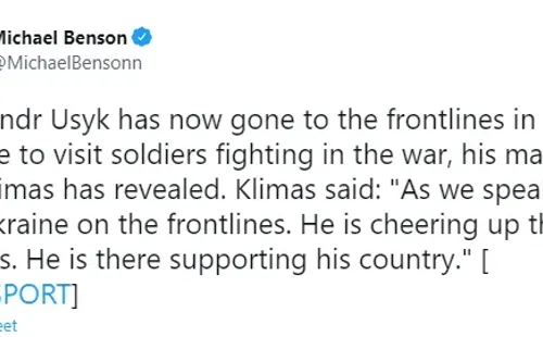 Volvió a demostrarlo en los últimos días, pues según le contó a TalkSports su managerEgis Klimas el campeón mundial unificado de peso pesado se llegó hasta uno de los frentes de batalla en Ucrania para visitar a los soldados que están resistiendo la invasión.“Mientras hablamos, él está en Ucrania en primera línea. Está animando a los soldados. Está allí apoyando a su país”, expresó.