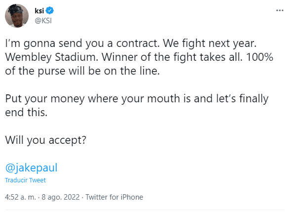 Para salir al rescate de Jake Paul, cuyo futuro ahora es incierto, apareció otro peleador que pertenece a la creciente rama de los boxeadores influencers. Se trata de KSI, quien supo vencer a su hermano Logan. “Te enviaré un contrato. Luchemos el año próximo”, comenzó escribiendo en su cuenta de Twitter.