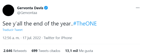 A través de las redes sociales, Gervonta Davis hizo llegar entonces una respuesta en tiempo real para el desafío que le lanzó El Niño Rey. “Nos vemos al final del año”, le escribió en Twitter, agregando a su comentario el hastag #TheOne, para proclamarse como el mejor peleador.