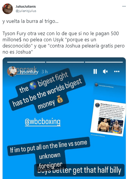 Si lo del Rey de los Gitanos no es puro circo, si va en serio en su pedido, hacer el combate por el campeonato mundial indiscutible de peso pesado ante Oleksandr Usyk será imposible. ¿Cuánto habría que pagar a Usyk, si Fury pide 500 millones, por ser él dueño de tres de los cuatro grandes cinturones? No hay manera.