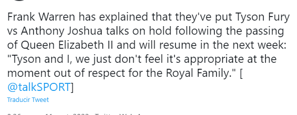 Pero Frank Warren, uno de los promotores de Tyson Fury, ya se encargó de comunicar que en señal de luto por el fallecimiento de Isabel II esas negociaciones han sido suspendidas.“Tyson y yo, simplemente no creemos que sea apropiado en este momento. Nuestro respeto a la familia real”, expresó en diálogo con TalkSPORT.
