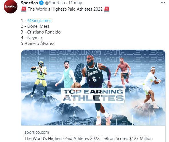 Los datos que arrojó el estudio de Sportico determinaron que por encima de Canelo Álvarez el deportista que más dinero ganó en los últimos 12 meses fue LeBron James, con 127 millones de dólares. Por detrás de la súperestrella de la NBA pero también por encima del mexicano aparecen los nombres de Lionel Messi (122 millones), Cristiano Ronaldo (115 millones) y Neymar (103 millones).
