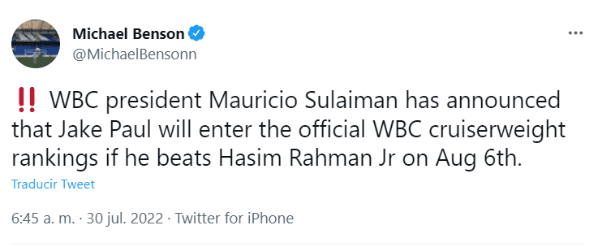 Sucede que Mauricio Sulaimán, presidente del Consejo Mundial de Boxeo, ya avisó que le abrirá a Jake Paul las puertas de los rankings oficiales del organismo si logra vencer aHasim Rahman Jr en el combate que los pondrá cara a cara el próximo 6 de agosto en el Madison Square Garden.