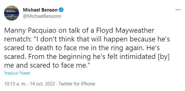 De manera insólita, surgió la posibilidad de que su regreso profesional sea ante el ganador del combate por el campeonato mundial indiscutible de peso wélter que todavía está discutiéndose entre Errol Spence y Terence Crawford. Posibilidad para nada recomendable, por cierto. Pero también apareció en el horizonte el nombre de Floyd Mayweather, un pionero en continuar llenándose los bolsillos con combates de exhibición tras el retiro.