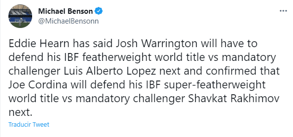 Dicho cinturón deberá ser defendido en los próximos meses según adelantó Eddie Hearn, quien promueve su carrera desde MatchRoom Boxing. El organismo sancionador dio la orden de hacerlo ante el retador mandatorio Luis Alberto López, otro peleador azteca que podría sumergirlo en viejas pesadillas.