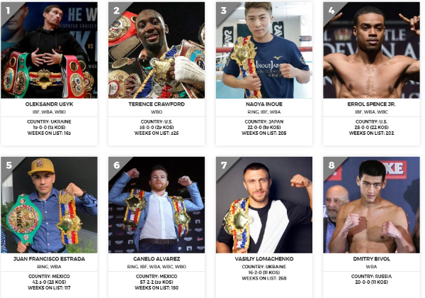 La clasificación ahora ubica como el mejor peleador libra por libra del mundo a Oleksandr Usyk, quien tras ser indiscutible en el peso crucero subió a conquistar el peso pesado y ha logrado ya hacerse de tres de los cuatro cinturones de un solo tiro, venciendo en decisión unánime a Anthony Joshua en septiembre del año pasado.