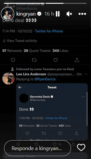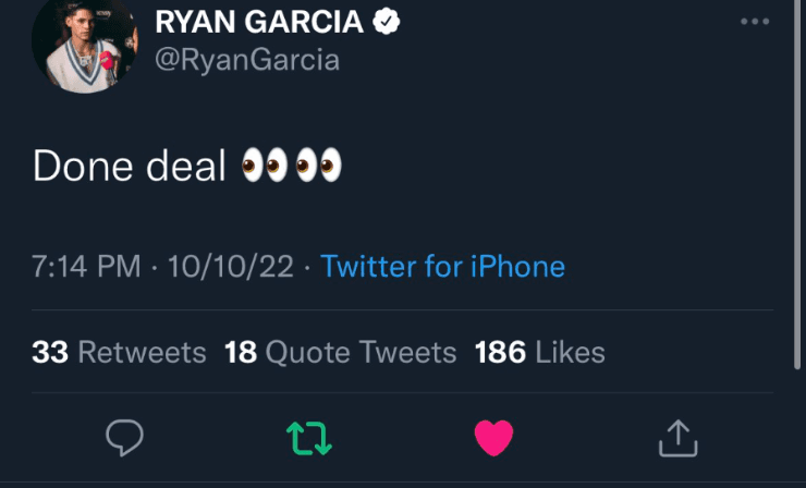 Apenas pasadas las siete de la tarde en los Estados Unidos, Tank escribió “hecho” en su cuenta de Twitter. El mensaje tomó todavía mayor peso cuando minutops más tarde el que tuiteó fue Ryan García: “Trato hecho”, escribió. ¿Será anunciado en los próximos días el combate entre ambos?