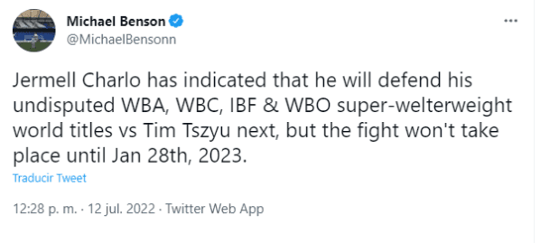 Este martes, fue el propio Jermell Charlo el encargado de confirmar que defenderá sus títulos mundiales de la AMB, la FIB, el CMB y la OMB ante Tim Tszyu, aunque la pelea no sucederá este año, pues dijo que está programada, cuando todavía no se ha hecho ningún anuncio oficial, para el 28 de enero de 2023.