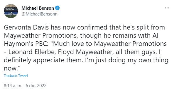 “Mucho amor para Mayweather Promotions, Leonard Ellerbe, Floyd Mayweather y todos esos muchachos. Definitivamente los aprecio, pero ahora estoy haciendo lo mio”, expresó Davis como despedida y antes de unirse a las filas de Al-Haymon y el establo de PBC.