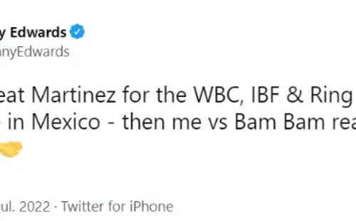 Está claro que el británico no tiene ningún problema con pelear fuera de casa y confía en quedarse con la victoria incluso si Julio César Martínez hace de local en México. “Cuando venza a Martínez en México por los cinturones de la FIB, el CMB y The Ring, entonces quiero a Bam Rodríguez. Realmente sería una gran pelea, ¿no?”, escribió en su cuenta de Twitter.