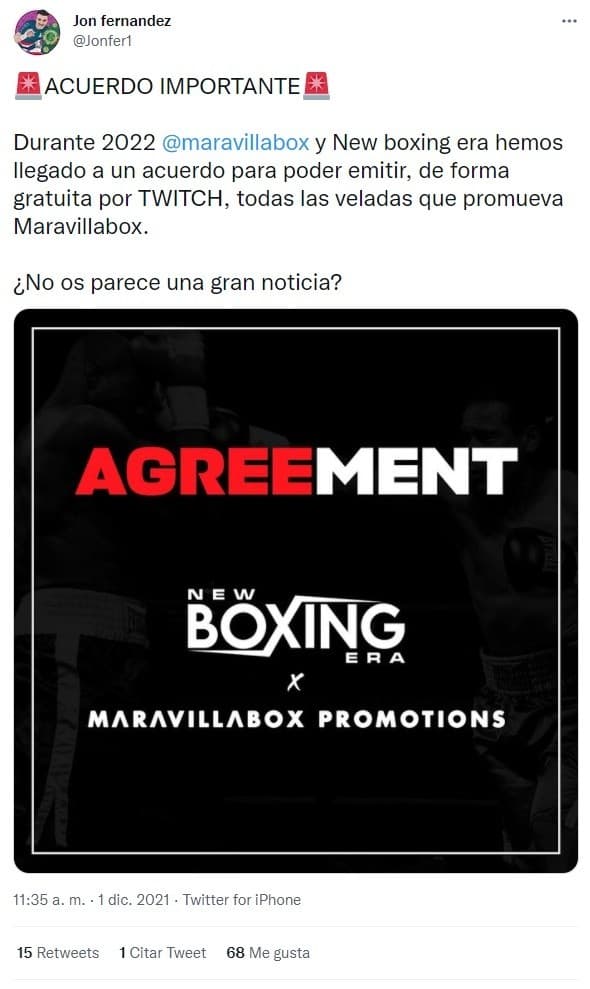 El convenio se da luego de que Maravilla Martínez haya estado presente en el rincón de John Fernández, reconocido streamer español que peleó en el evento que organizó Ibai Llanos. Según lo expresado por Fernández, Maravilla Box y New Boxing transmitirán veladas boxísticas en el año entrante, pero por el momento no se han confirmaron fechas ni las peleas que se realizarán.
