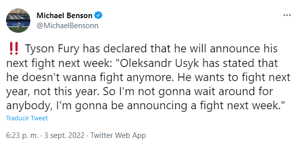 Pero Tyson Fury quiere hacer una pelea más este año, aunque no sea ante Usyk, para comenzar a ganar ritmo pensando en ese combate por los cuatro cinturones. Y así lo hizo saber:“Oleksandr Usyk ha declarado que ya no quiere pelear. Quiere pelear el próximo año, no este año. Así que no voy a esperar a nadie, voy a anunciar una pelea la próxima semana“, manifestó.