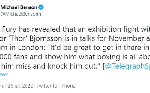 Este martes, en dialogo con Telegraph Sport, Tyson Fury reconoció que está negociando una próxima pelea, aunque ello no le significaría salir del retiro, pues se trata de una exhibición. Las intenciones pasan por que suceda en noviembre, en Londres, y su rival seríaHafthor ‘Thor’ Bjornsson, más conocido por el personaje de La Montaña que lo popularizó mundialmente en la serie Game of Thrones.