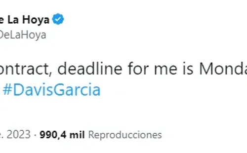 Tal es así que Oscar De La Hoya, quien promueve desde Golden Boy la carrera de García, ya salió a poner un plazo desde sus redes sociales para que el equipo de Gervonta Davis se defina. “No tengo en mi poder ningún contrato. El plazo para mí es el lunes o seguiremos adelante”, escribió este domingo en su cuenta de Twitter.
