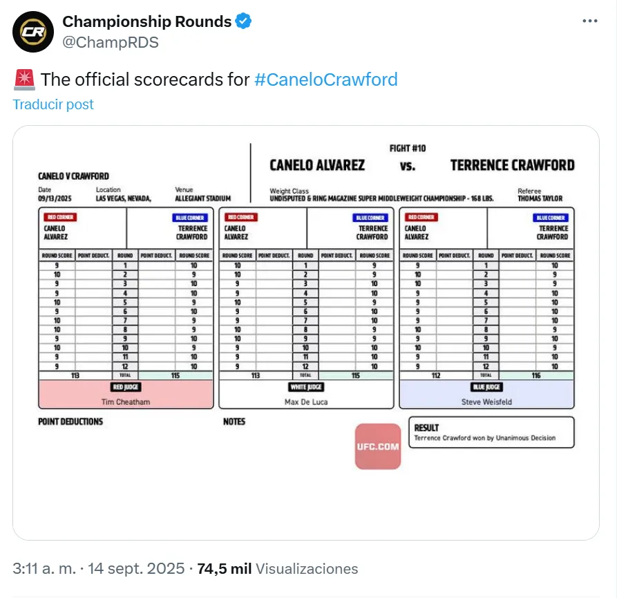 Terence Crawford ofreció una gran actuación en el Allegiant Stadium, logrando vencer a Canelo Álvarez por decisión unánime y arrebatándole sus cuatro títulos de la división supermediana. Las tarjetas de los jueces reflejaron puntuaciones de 116-112, 115-113 y 115-113 tras 12 asaltos.