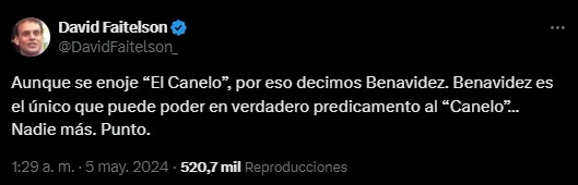 En este sentido, el controversial conductor David Faitelson se sumó a la euforia del público y hasta se animó a dar su predicción sobre una hipotética pelea entre ambos en el cuadrilátero. “Aunque se enoje El Canelo, Benavidez es el único que lo puede poder en verdadero predicamento, nadie más, punto”, disparó el reportero de la señal televisiva de TUDN tras el evento de anoche.