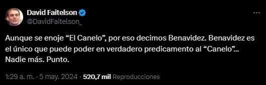 Por otra parte, claramente disgustado con el ganador, cuestionó el testimonio de Saúl, que post-contienda había asegurado que por una fortuna sí enfrentaría a su par de los Estados Unidos. “El Canelo dijo después de la pelea ‘si hay dinero, peleo hoy con Benavídez… ¿Y si dejamos de hablar de dinero y nos ponemos a pensar un poco en el boxeo y sus aficionados?”, apuntó el polémico conductor, que se cruzó con varios usuarios en la noche mexicana por sus públicas opiniones.
