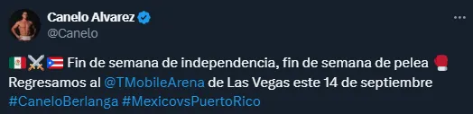 “Fin de semana de independencia, fin de semana de pelea. Regresamos al T-Mobile Arena de Las Vegas este 14 de septiembre. #CaneloBerlanga. #MexicovsPuertoRico”, publicó la cuenta de Canelo Álvarez en las redes sociales.