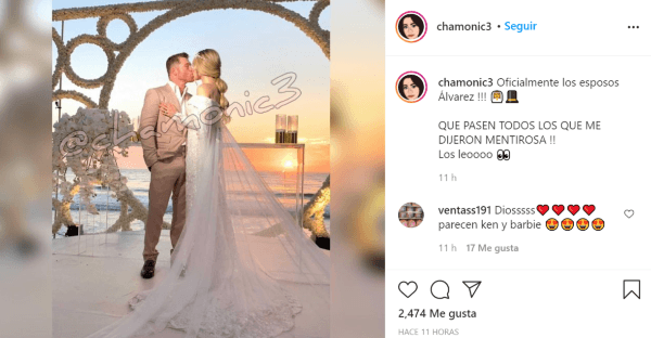 Las pocas imágenes que hasta ahora han trascendido de la boda, alrededor de la cual hubo un gran hermetismo, fueron publicadas en la cuenta de Instagram deChamonic3. Allí se puede ver al tapatío usando un elegante traje color natural y a la novia de blanco impoluto, con una finísima corona.