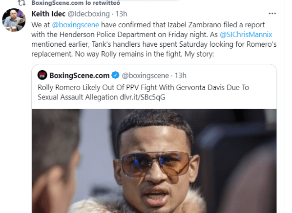 Poco después, fue en el mismo portal donde se confirmó que Romero ya no sería parte de la cartelera del 5 de diciembre y que ya se estaba trabajando en buscar un nuevo contendiente al título mundial que Gervonta Davis ostenta en la división de peso ligero.