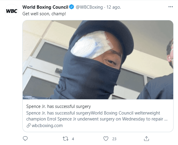 “Recibí una emotiva carta de nuestro campeón Errol Spence Jr, en la que agradece al Consejo Mundial de Boxeo por brindarle el apoyo para mantenerlo como campeón; la salida más fácil hubiera sido sancionar a Pacquiao vsUgas por nuestro título. O también para abrir un interino, pero no fue así. El CMB ratificó su apoyo, y el informe médico fue satisfactorio, por lo que volverá al ring tan pronto como sea posible“, dijo.