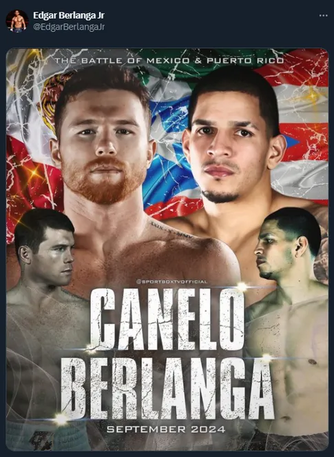 Luego del combate entre Saúl y Jaime Munguía, Berlanga hizo una publicación llamativa en las redes sociales. Con una imagen, como si fuera el anuncio oficial de la pelea, Edgar retó a Canelo Álvarez, y hasta se animó a poner una fecha para el evento: septiembre de 2024.