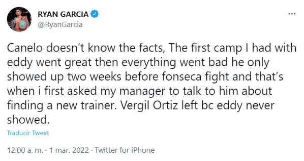 En declaraciones recientes a ES News, el propio multicampeón tapatío, que había estado muy cerca de Ryan García durante todo su desarrollo como profesional, incuso tomándolo como su protegido, se permitió dudar de esas razones.“No sé qué pasó. No sé lo que está pensando. Dice que quiere más tiempo, ¿verdad? Eddy tiene todo el tiempo para él.ddy estuvo aquí en Navidad, Año Nuevo, todo para él cuando peleó con Luke Campbell. Luego, ¿qué pasó?Algo con él, no estoy seguro”, manifestó.