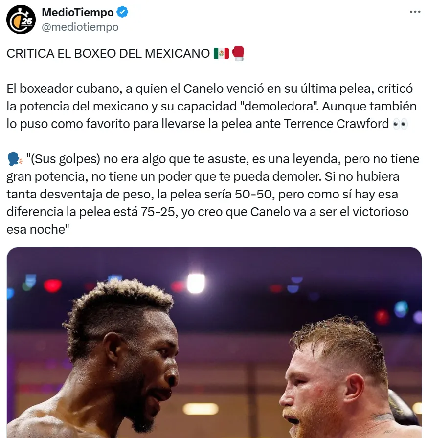“Sus golpes no eran algo que te asuste, es una leyenda, pero no tiene gran potencia, no tiene un poder que te pueda demoler”, comenzó diciendo el cubano que a pesar de que no pudo contra Canelo, cree que este no cuenta con un gran golpe en sus manos.