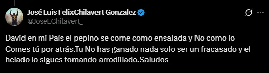 Unas horas más tarde, José Luis Chilavert se tomó el tiempo de responderle al corresponsal televisivo. Fiel a su estilo, el golero no tuvo ni un poquito de cordura para dirigirse a quien lo había criticado. “David en mi país el pepino se come como ensalada y no como lo comes tú por atrás. Tú no has ganado nada solo ser un fracasado y el helado lo sigues tomando arrodillado. Saludos”, sentenció el paraguayo, haciendo caer sobre sí mismo una lluvia de críticas de usuarios mexicanos, la mayoría tildándolo de ordinario o discriminador.