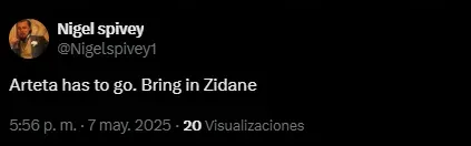 En ese sentido, los simpatizantes del conjunto londinense han pedido la destitución de Mikel Arteta y la llegada de otro timonel para el plantel profesional. Muchos fanáticos han elegido a Zinedine Zidane como el sucesor preferido para el español. El francés se encuentra hace tiempo sin trabajo, pero recientemente ha expresado sus intenciones de volver al ruedo.