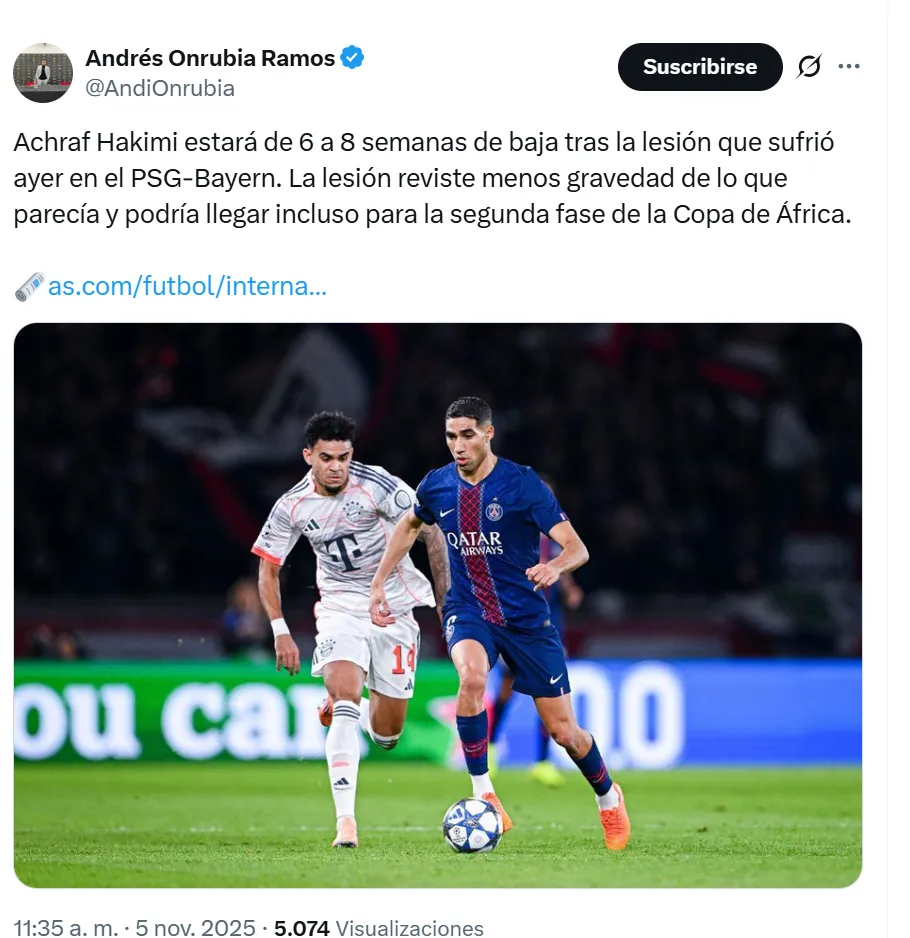 El partido entre PSG y Bayern Múnich por la cuarta jornada de la UEFA Champions League 2025-26 que se disputó en el Parque de los Príncipes y que terminó 2-1 a favor de los alemanes, se vio afectado por la lesión de Achraf Hakimi.