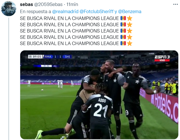 Tras este histórico triunfo del Sheriff Tiraspol en el mismísimo Santiago Bernabéu y ante la sorpresa de todos, los usuarios no tardaron en compartir memes para todos los gustos. Algunos aficionados del Real Madrid se rieron de su propio equipo, mientras que los ajenos repartieron cargadas para el Merengue y elogios para el humilde conjunto.