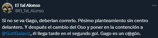 Tal es así que, en las redes sociales, Gago fue duramente criticado por los aficionados. Entre otros comentarios, muchos pidieron que, en caso de que el DT no vaya a Boca Juniors, la directiva lo corra de su puesto. Sin embargo, claro está que ese fue uno de los cientos de opiniones contra el entrenador.