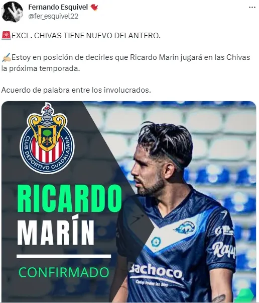 De acuerdo a información del periodista vinculado al mercado, Fernando Esquivel, Chivas de Guadalajara se ha asegurado el fichaje de Ricardo Marín para el Apertura 2023. Centroatacante de 25 años, fue formado en Coapa y llegó a jugar en la Primera División del Azulcrema, aunque su último equipo ha sido el Celaya de la Liga de Expansión.