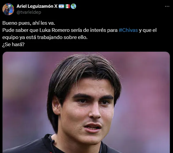 Según lo revelado por el periodista Ariel Leguizamón de TV Azteca Jalisco, el Guadalajara ya estaría trabajando para tratar de sumar a Luka Romero al equipo de cara al inicio de 2025. El extremo de 20 años está actualmente a préstamo en el Alavés de España.