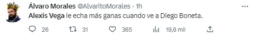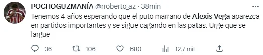 Además de una importante cantidad de memes hacia el 10 del Guadalajara, aficionados y periodistas dieron cuenta del bajo nivel de Alexis Vega.“Tenemos 4 años esperando que el p*** marr** de Alexis Vega aparezca en partidos importantes y se sigue cag*** en las patas”, arremetió un fanático. “Alexis Vega le echa más ganas cuando ve a Diego Boneta”, disparó el reconocido narrador Álvaro Morales. Unos pocos de los tantos comentarios vertidos hacia el delantero…