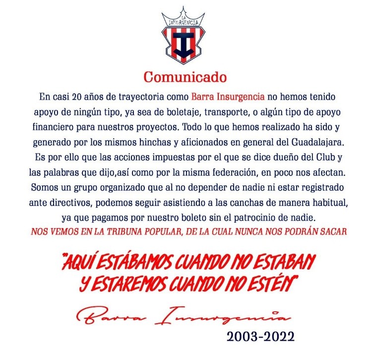 “En casi 20 años de trayectoria como Barra Insurgencia no hemos tenido apoyo de ningún tipo, ya sea de boletaje, transporte, o algún tipo de apoyo financiero para nuestros proyectos. Todo lo que hemos realizado ha sido generado por los mismos hinchas y aficionados en general del Guadalajara.