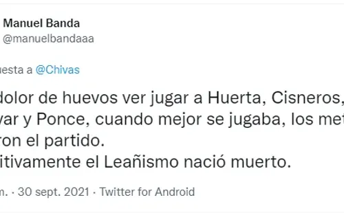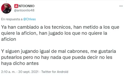 En la publicación oficial de la cuenta del Guadalajara en Twitter que indicaba el resultado del partido que se disputó ayer en el Estadio Corregidora, diversos seguidores atacaron fuertemente al equipo. Los enojos estuvieron dirigidos a los jugadores más que a la directiva y al estratega, que vivió su segundo duelo en pocos días.