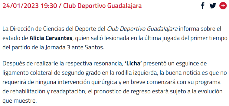 La Dirección de Ciencias del Deporte del Club Deportivo Guadalajara informa sobre el estado de Alicia Cervantes, quien salió lesionada en la última jugada del primer tiempo del partido de la Jornada 3 ante Santos.