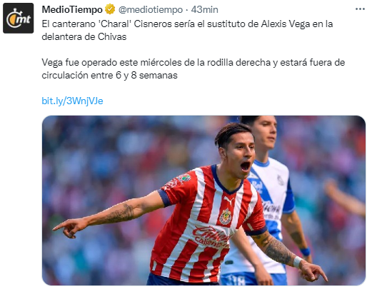 Alexis Vega sufrió unalesión en la rodilla derecha ante Atlético de San Luis, y en las últimas horas fue intervenido quirúrgicamente, en lo que se trató de una artoscopía que requirió un recorte de menisco, de acuerdo al reporte médico emitido por la institución. ¿Su tiempo de recuperación? Entre seis y ocho semanas.