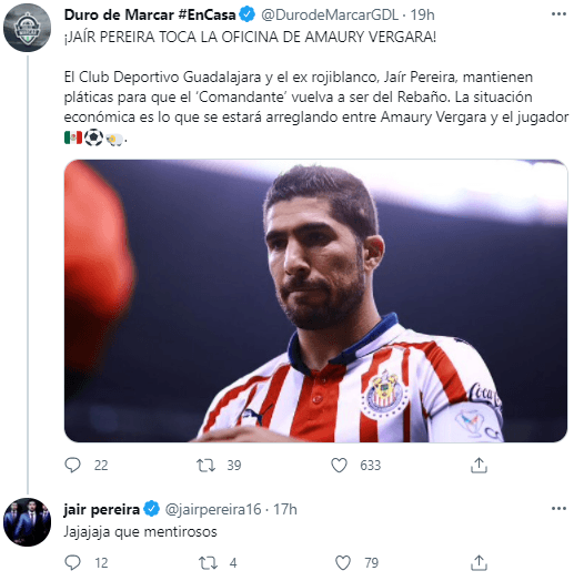 El nombre eranada más ni nada menos que Jair Pereira, un viejo conocido de la casaque pasó por el club entre 2014 y 2019. “¡JAÍR PEREIRA TOCA LA OFICINA DE AMAURY VERGARA! El Club Deportivo Guadalajara y el ex rojiblanco, Jaír Pereira, mantienen pláticas para que el ‘Comandante’ vuelva a ser del Rebaño. La situación económica es lo que se estará arreglando entre Amaury Vergara y el jugador”, señaló la fuente. Sin embargo, el propio futbolista se despegó de los rumores.