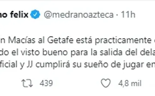 “SE VA JJ. Lo de José Juan Macías al Getafe está prácticamente cerrado. Amaury Vergara ha dado el visto bueno para la salida del delantero. Falta poco para que se haga oficial y JJ cumplirá su sueño de jugar en Europa“, sentenció el también comentarista de TV Azteca.
