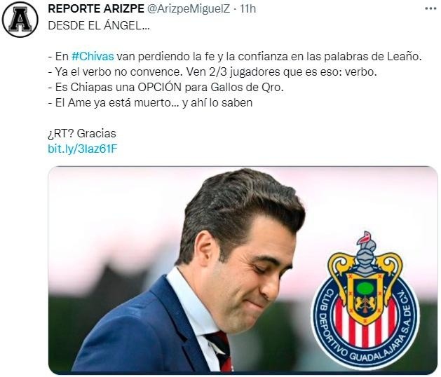 De acuerdo a información del periodista de Mediotiempo, Miguel Arizpe, la directiva de Chivas ya no le cree de la misma manera a Leaño. “Lo que sí me dijo es que cada día qué pasa, cada fin de partido, van perdiendo la fe y la confianza en las palabras de su DT. Sus declaraciones triunfalistas ya son cuestionadas por dos que tres aquí. Ya no gusta a todos que sus palabras no vayan con la realidad. El verbo se acaba”, detalló.