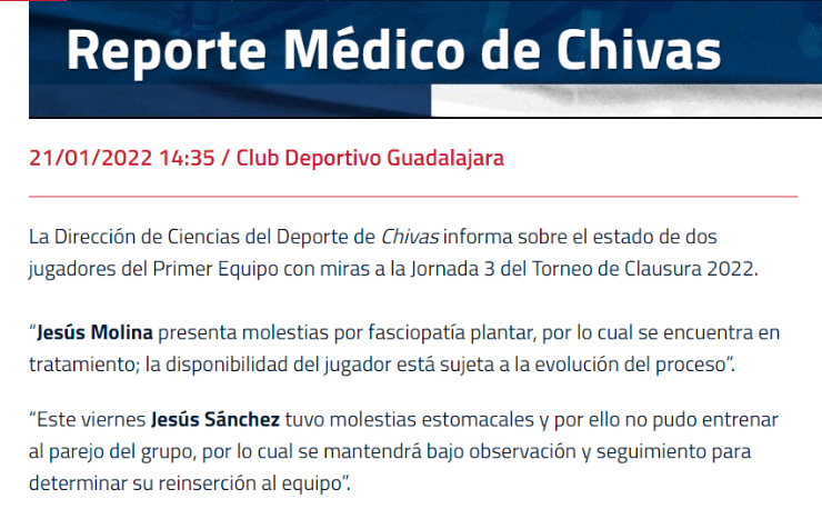 A este se suman los dos anunciados en el último comunicado del cuadro de Guadalajara. Uno de ellos es Jesús Molina, quien presentó “molestias por fasciopatía plantar” y se encuentra en tratamiento, por lo que no es seguro que pueda sumar minutos frente a Querétaro.
