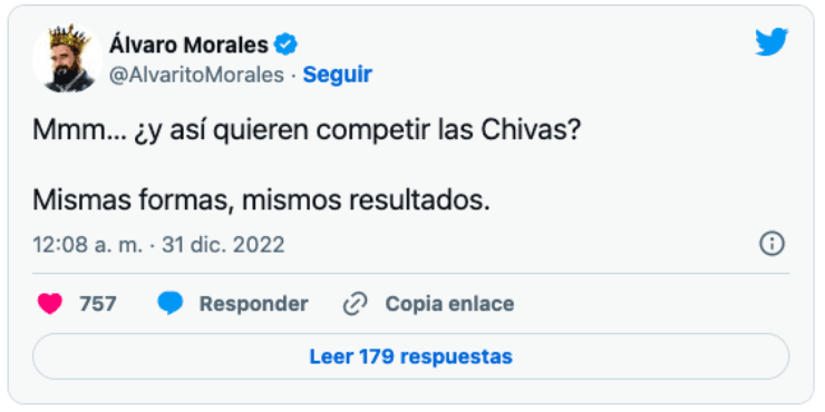 “Mmm… ¿y así quieren competir las Chivas? Mismas formas, mismos resultados”, escribió Morales a través de su cuenta de Twitter, a propósito de las constantes concesiones defensivas del Rebaño Sagrado y la complicidad del Wacho Jiménez en el segundo gol de la Máquina.