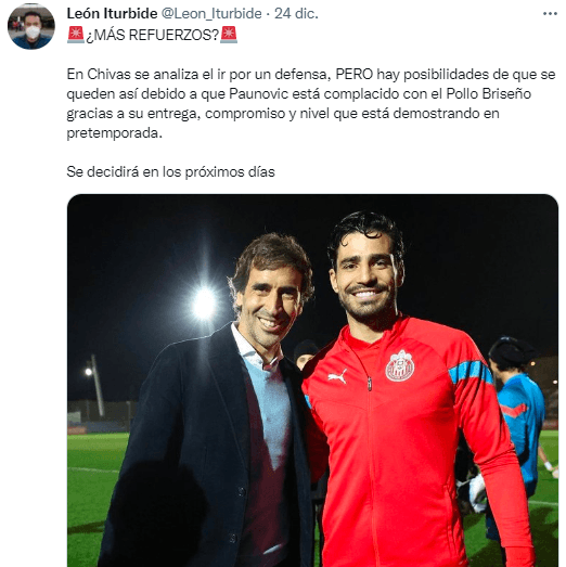 En tal sentido, en el equipo tapatío continuarían analizando la idea de intentar por un zaguero. Sin embargo, también existirían alternativas al interior de la institución: de acuerdo al reportero de Bolavip y Rebaño Pasión, León Iturbide, a Paunovic le ha gustado el nivel y compromiso que Antonio Briseño ha mostrado a lo largo de la pretemporada.