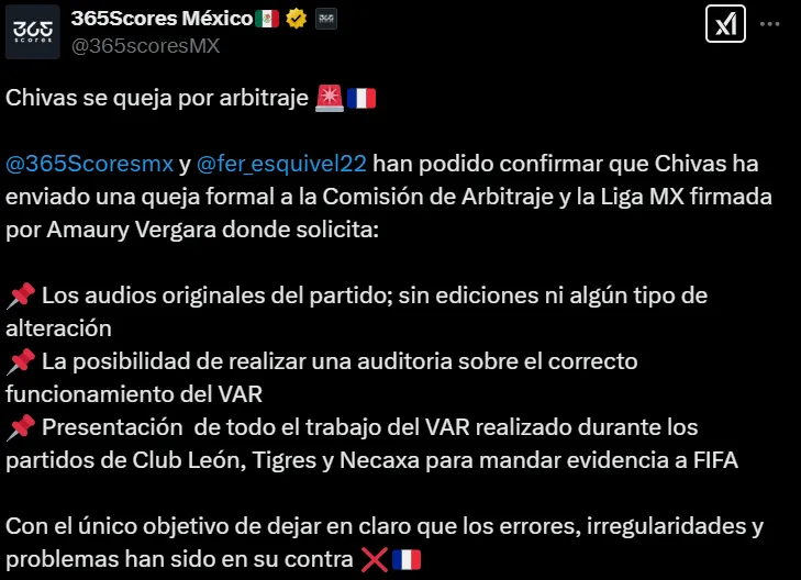 Según información de Fernando Esquivel en 365 Scores México, Chivas envió una queja formal a la comisión de arbitraje y a la Liga MX. En la misma, exigen que se les entreguen los audios originales del VAR sin modificaciones ni ediciones, con el objetivo de revisar la jugada nuevamente. Además, solicitaron una auditoría sobre el correcto funcionamiento del VAR en la Liga MX.