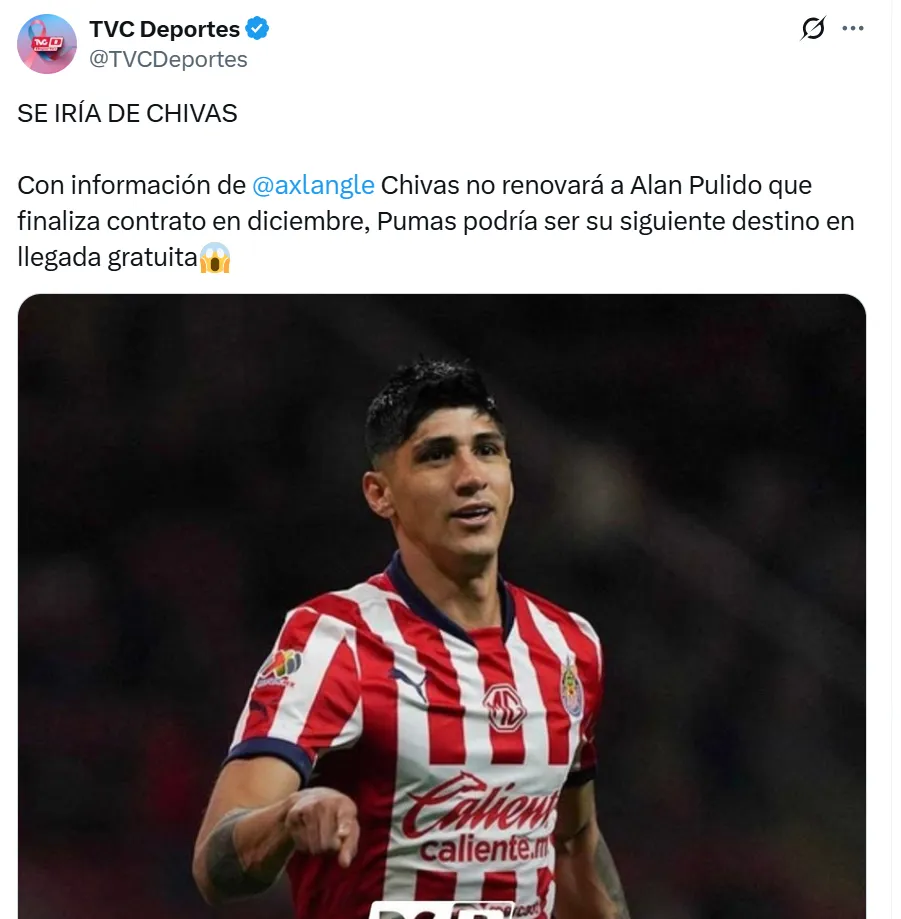 De acuerdo a la información de Axel Langle de TVC Deportes, la directiva de Chivas habría tomado la decisión de no extender el vínculo del atacante mexicano que termina a fin de año y su próximo destino podría ser Pumas, que está en búsqueda de delanteros para el 2026.