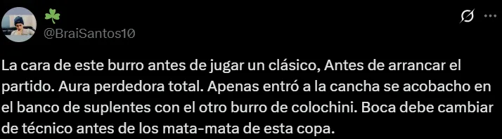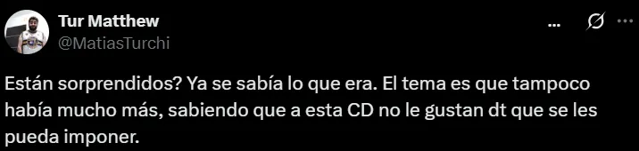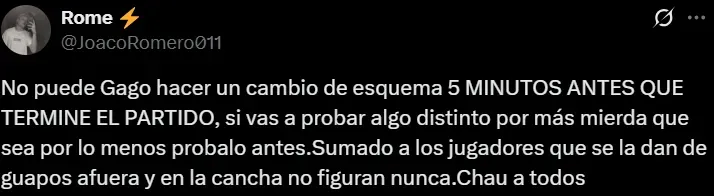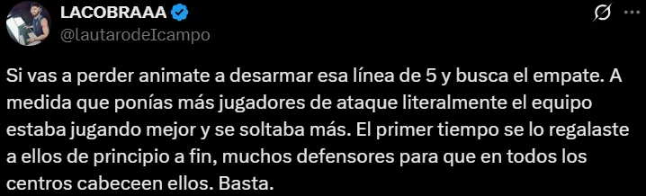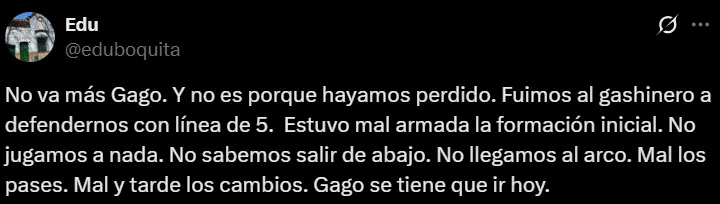 Así, se pudieron leer mensajes como “el primer tiempo se los regalaste a ellos de principio a fin, muchos defensores para que en todos los centros cabeceen”, “se tiene que ir ya”, “tiene aura perdedora”, “échenlo por favor” y otros comentarios con durísimos epítetos e insultos para el DT de 39 años.